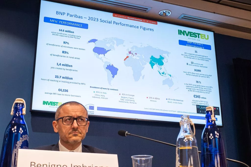 Infine, Claudia Belli, Responsabile Finanza inclusiva e relazioni con la società civile di BNP Paribas, e Benigno Imbriano, Amministratore Delegato di PerMicro, hanno condotto l’ultimo panel del workshop. Hanno presentato il loro modello di partnership banca-operatore microcredito.